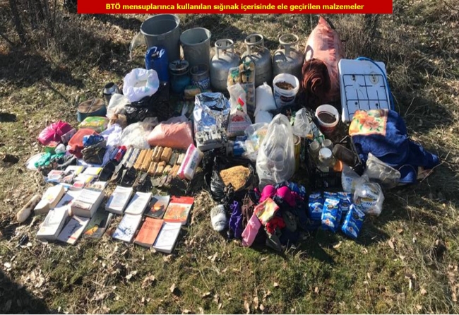 "1 adet 500 litrelik su deposu, el yapımı patlayıcı düzeneğinde kullanılmak üzere 4 adet büyük tüp, 5 adet küçük tüp, 1 adet 12’li pil bloğu, 1 adet 8’li pil bloğu, 3 adet akü, 26 adet pil ile 4 adet kütüklük, 4 adet terörist kıyafeti, 247 adet muhtelif konserve, çok sayıda yaşam, giyim, tıbbi malzeme ve örgütsel doküman."