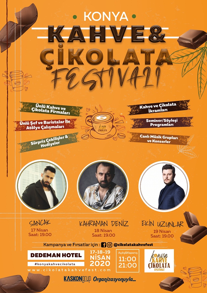 Festival tadında geçecek organizasyonda tüm kahve ve çikolata tutkunları ilk defa Dedeman Hotel’de buluşacak. Sektör öncüleri ve 3'üncü nesil kahve akımını barındıran festivalde üç gün boyunca birbirinden renkli ve “lezzetli” aktiviteler yer alacak. Festival tadındaki bu organizasyonda atölye çalışmaları, seminer ve konferanslarda tüm ziyaretçilere akademik bir gösteri sunulacak. Kaskon Grup ev sahipliğinde gerçekleşecek olan Konya Kahve & Çikolata Festivali, sosyal nitelik taşımasının yanı sıra birçok sektörü bir araya getirmeyi de hedefliyor. Festival kapsamında en sevilen lokal kahve dükkanlarının yanı sıra dünyaca ünlü coffee shop'lar, kendi evinin baristası olmak isteyenler için çeşitli atölyeler ve seminerler, farklı aktivite alanlarında yeni deneyimler ve sevilen müzisyenlerin konserleri yer alacak. Festivalde farklı tatları deneme imkanı bulacak olan ziyaretçiler, festival alanında yapılacak olan farklı etkinlikler ile eğlenceye de doyacaklar.