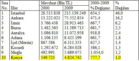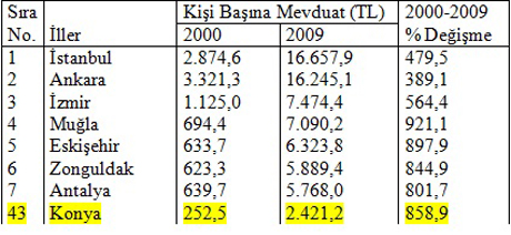 Burada şöyle bir fark var, 2000 yılında Konya’da bankalarda kişi başına düşen mevduat 252 lirayken, bu rakamın ancak üçte biri kredi olarak kullanılıyordu. 2009 yılında ise kredi kullanımı mevduatı yakalamış durumda.