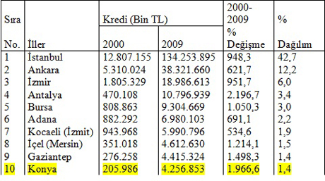 Başka bir değişle 2000 yılında Konya’da yaşayan biri bankalardan sadece 95 lira kredi almışken bu rakam 2009 yılında 25 kat artarak 2136 liraya ulaştı.