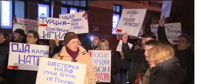 Rusya'ya ait bir savaş uçağının Türkiye tarafından düşürülmesinin ardından, Türkiye'nin Moskova Büyükelçiliği önünde protesto düzenlendi.