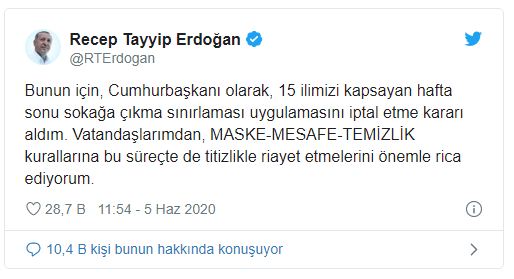 "Fakat vatandaşlarımızdan aldığımız değerlendirmeler, bizi kararı yeniden gözden geçirmeye yöneltti. Tek amacı hastalığın yayılmasını önlemek ve vatandaşımızı korumak olan bu kararın, farklı sosyal ve ekonomik sonuçlara yol açacağı anlaşıldı. 2,5 aylık bir aradan sonra yeniden günlük hayatını düzenlemeye başlayan vatandaşlarımızın sıkıntıya düşmesine gönlümüz razı olmadı. Bunun için, Cumhurbaşkanı olarak, 15 ilimizi kapsayan hafta sonu sokağa çıkma sınırlaması uygulamasını iptal etme kararı aldım. Vatandaşlarımdan, maske-mesafe-temizlik kurallarına bu süreçte de titizlikle riayet etmelerini önemle rica ediyorum."