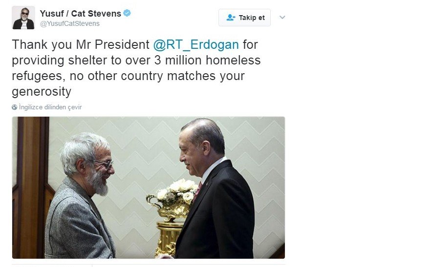 Yusuf İslam yaptığı paylaşımda şu ifadelere yer verdi: "3 milyonu aşkın mülteciye sığınak sağladığınız için teşekkürler sayın başkan. Sizin cömertliğiniz başka hiç bir ülkeyle kıyaslanamaz."